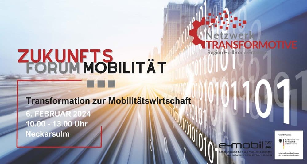 Das Netzwerk TRANSFORMOTIVE Heilbronn-Franken lädt dich herzlich zum „Zukunftsforum Mobilität. Die Transformation zur Mobilitätswirtschaft in Heilbronn-Franken“ ein. Gemeinsam mit der e-mobil BW und den Beratungsunternehmen MHP und MOND werden Unterstützungsangebote für kleine und mittelständige Unternehmen vorgestellt und spannende Trends sowie mögliche, neue Geschäftsmodelle diskutiert.